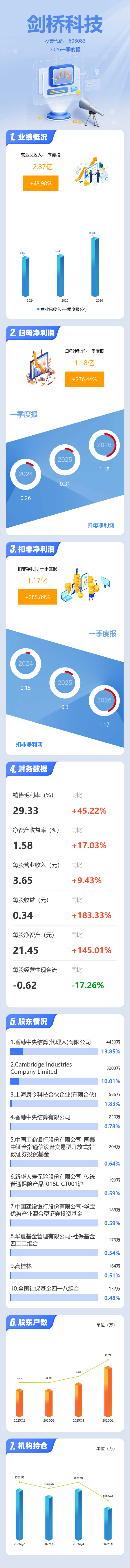 证券之星消息,剑桥科技2026年一季报显示,一季度公司主营收入12.87亿元,同比上升43.98%;归母净利润1.18亿元,同比上升276.44%;扣非净利润1.17亿元,同比上升285.9%;负债率32.01%,投资收益-201.52万元,财务费用1.25亿元,毛利率29.33%。