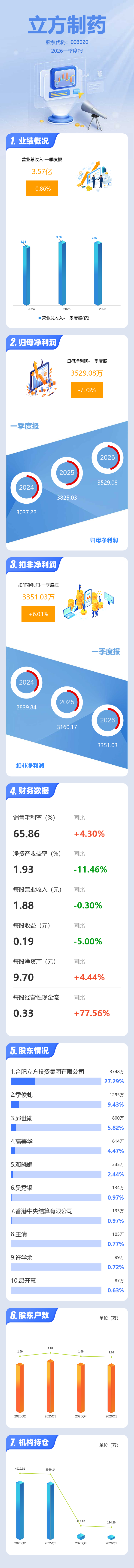 证券之星消息,立方制药2026年一季报显示,一季度公司主营收入3.57亿元,同比下降0.87%;归母净利润3529.08万元,同比下降7.74%;扣非净利润3351.03万元,同比上升6.04%;负债率25.03%,投资收益-90.68万元,财务费用18.38万元,毛利率65.86%。