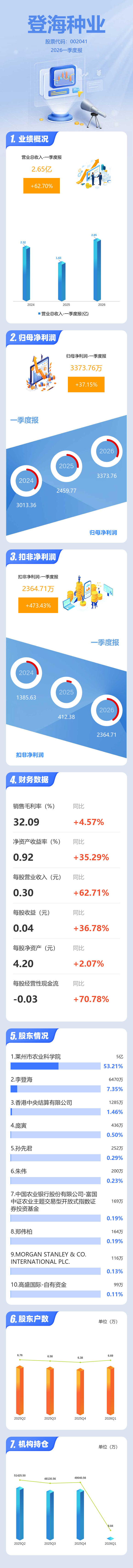 证券之星消息,登海种业2026年一季报显示,一季度公司主营收入2.65亿元,同比上升62.7%;归母净利润3373.76万元,同比上升37.16%;扣非净利润2364.71万元,同比上升473.43%;负债率15.84%,投资收益127.84万元,财务费用-909.0万元,毛利率32.09%。