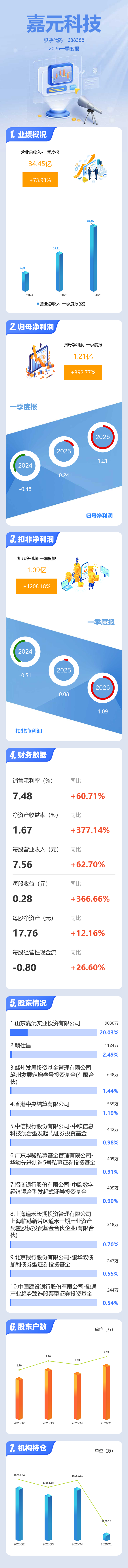 证券之星消息,嘉元科技2026年一季报显示,一季度公司主营收入34.45亿元,同比上升73.94%;归母净利润1.21亿元,同比上升392.77%;扣非净利润1.09亿元,同比上升1208.18%;负债率45.68%,投资收益-1130.39万元,财务费用3278.77万元,毛利率7.48%。
