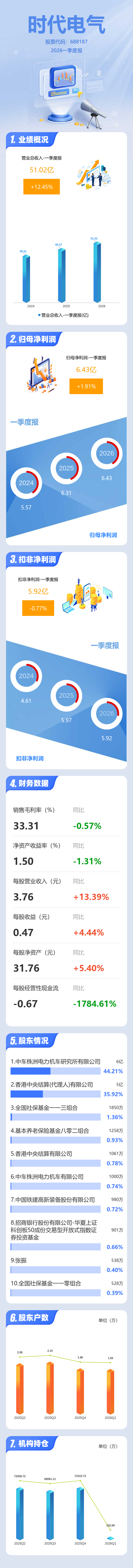 证券之星消息,时代电气2026年一季报显示,一季度公司主营收入51.02亿元,同比上升12.45%;归母净利润6.43亿元,同比上升1.91%;扣非净利润5.92亿元,同比下降0.78%;负债率35.29%,投资收益-229.35万元,财务费用-1675.64万元,毛利率33.31%。