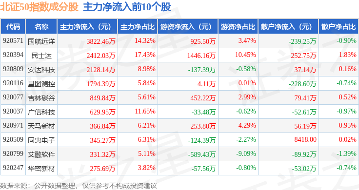资金流向方面,北证50(899050)指数成份股当日主力资金净流出合计1.47亿元,游资资金净流出合计6395.93万元,散户资金净流出合计1037.61万元。成份股资金流向详情见下表:
