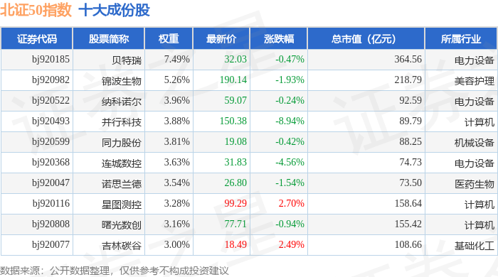 北证50(899050)指数十大成份股详情如下: