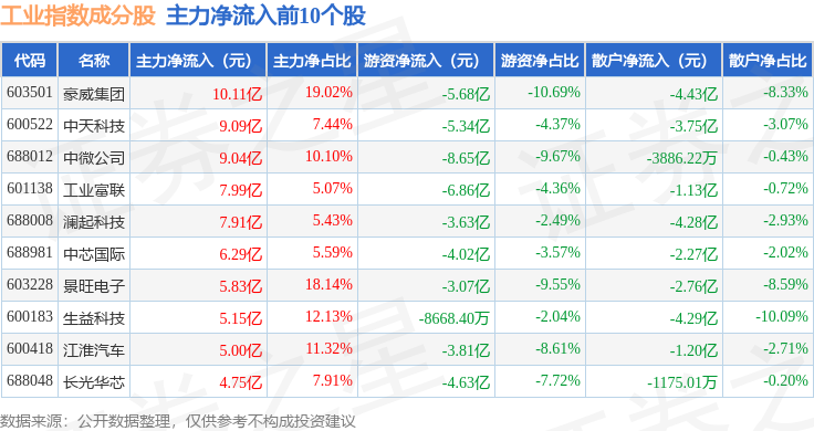 资金流向方面,工业指数(000004)成份股当日主力资金净流出合计80.83亿元,游资资金净流出合计33.88亿元,散户资金净流入合计114.72亿元。成份股资金流向详情见下表:
