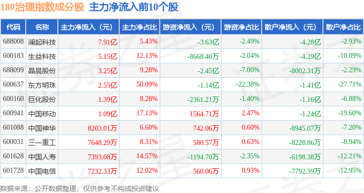 资金流向方面,180治理(000021)指数成份股当日主力资金净流出合计50.74亿元,游资资金净流入合计20.37亿元,散户资金净流入合计30.37亿元。成份股资金流向详情见下表: