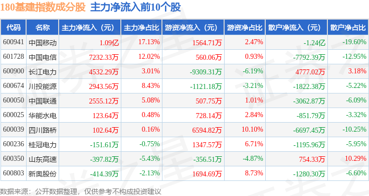 资金流向方面,180基建(000025)指数成份股当日主力资金净流出合计8.0亿元,游资资金净流入合计3.79亿元,散户资金净流入合计4.21亿元。成份股资金流向详情见下表: