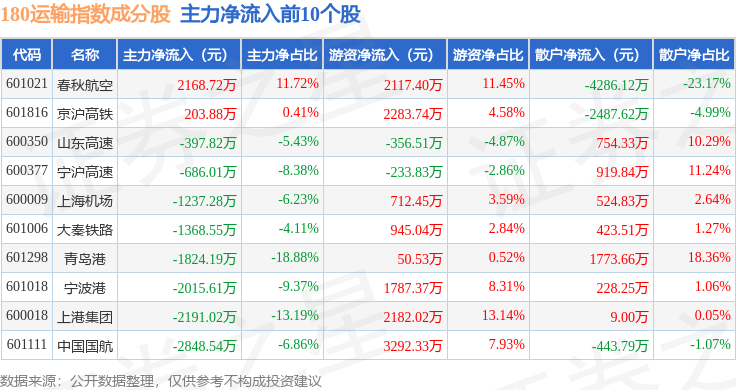 资金流向方面,180运输(000027)指数成份股当日主力资金净流出合计4.06亿元,游资资金净流入合计3.22亿元,散户资金净流入合计8396.23万元。成份股资金流向详情见下表: