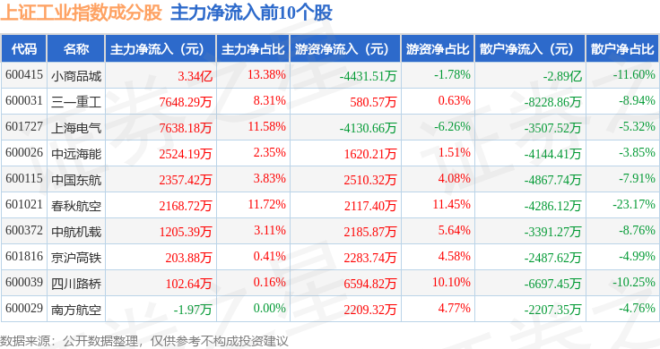 资金流向方面,上证工业(000034)指数成份股当日主力资金净流出合计32.54亿元,游资资金净流入合计7.5亿元,散户资金净流入合计25.04亿元。成份股资金流向详情见下表: