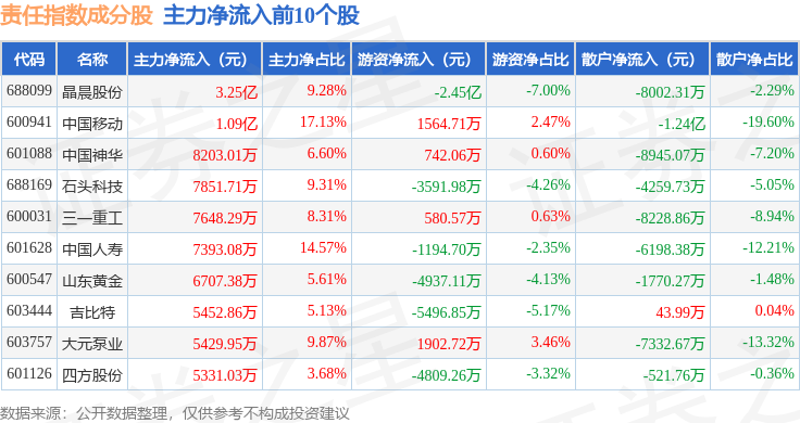 资金流向方面,责任指数(000048)成份股当日主力资金净流出合计26.05亿元,游资资金净流入合计5.99亿元,散户资金净流入合计20.05亿元。成份股资金流向详情见下表: