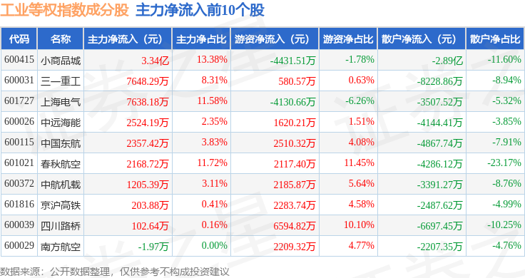 资金流向方面,工业等权(000072)指数成份股当日主力资金净流出合计32.54亿元,游资资金净流入合计7.5亿元,散户资金净流入合计25.04亿元。成份股资金流向详情见下表: