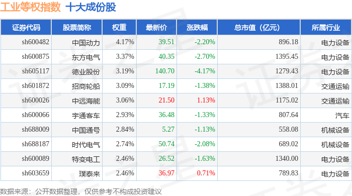 工业等权(000072)指数十大成份股详情如下: