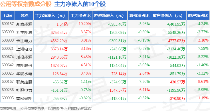 资金流向方面,公用等权(000079)指数成份股当日主力资金净流出合计3.68亿元,游资资金净流入合计1.54亿元,散户资金净流入合计2.14亿元。成份股资金流向详情见下表: