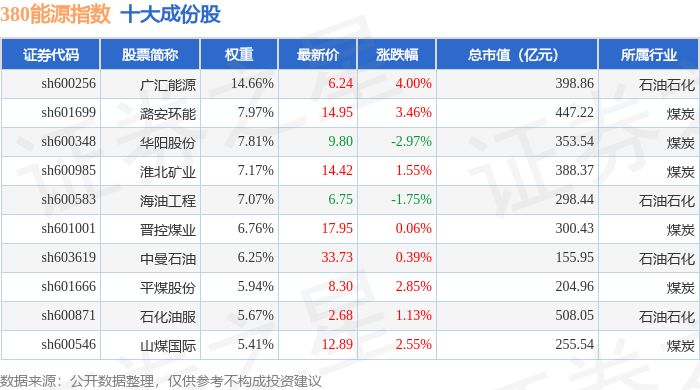 证券之星消息,4月27日,380能源(000104)指数报收于1543.95点,涨1.12%,成交70.42亿元,换手率1.49%。当日该指数成份股中,上涨的有12家,广汇能源以4.0%的涨幅领涨,下跌的有4家,华阳股份以2.97%的跌幅领跌。