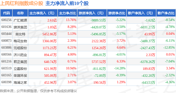 资金流向方面,上民红利(000153)指数成份股当日主力资金净流入合计2.18亿元,游资资金净流出合计1685.81万元,散户资金净流出合计2.01亿元。成份股资金流向详情见下表: