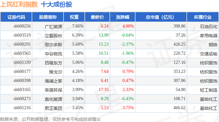 上民红利(000153)指数十大成份股详情如下: