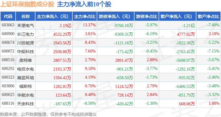 资金流向方面,上证环保(000158)指数成份股当日主力资金净流出合计21.44亿元,游资资金净流入合计3.26亿元,散户资金净流入合计18.18亿元。成份股资金流向详情见下表:
