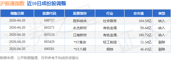 近10日内沪股通(000159)指数成份股做了调整,新纳入了3只股票,剔除了2只股票。