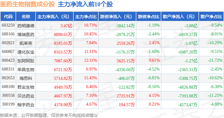 资金流向方面,医药生物(000808)指数成份股当日主力资金净流出合计5.92亿元,游资资金净流入合计6.03亿元,散户资金净流出合计1117.67万元。成份股资金流向详情见下表: