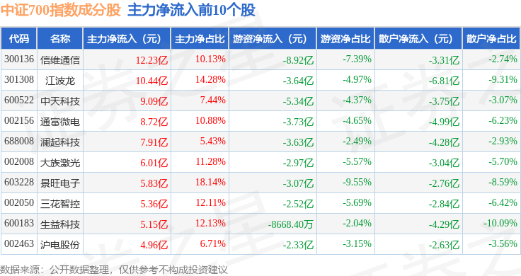 资金流向方面,中证700(000907)指数成份股当日主力资金净流出合计16.45亿元,游资资金净流出合计18.39亿元,散户资金净流入合计34.84亿元。成份股资金流向详情见下表: