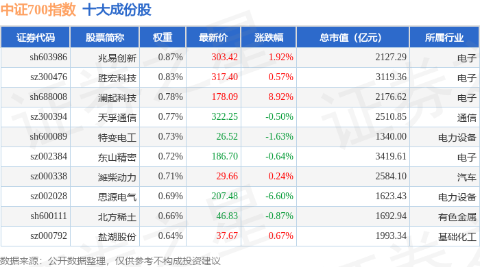 证券之星消息,4月27日,中证700(000907)指数报收于7105.88点,涨0.51%,成交8531.05亿元,换手率1.6%。当日该指数成份股中,上涨的有337家,芯源微以17.81%的涨幅领涨,下跌的有347家,锦浪科技以17.64%的跌幅领跌。
