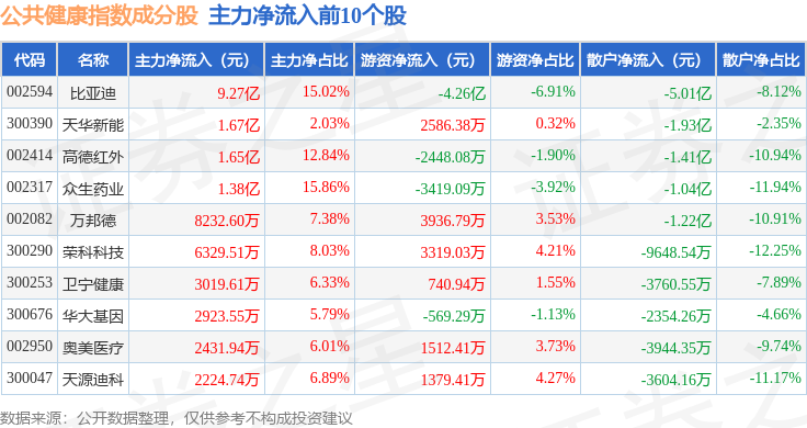 资金流向方面,公共健康(399277)指数成份股当日主力资金净流入合计3.14亿元,游资资金净流入合计1.2亿元,散户资金净流出合计4.33亿元。成份股资金流向详情见下表: