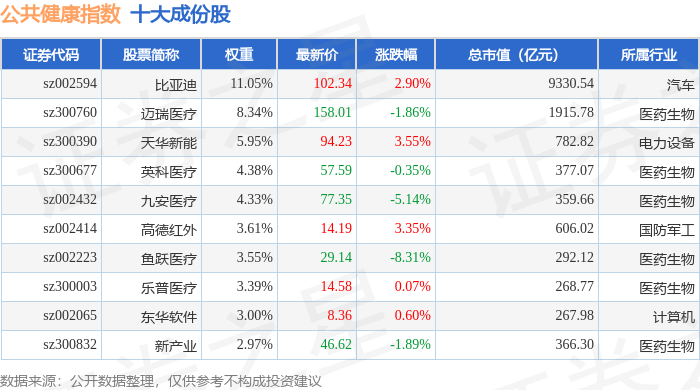 公共健康(399277)指数十大成份股详情如下: