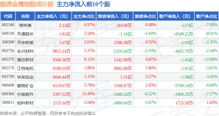资金流向方面,能源金属(399366)指数成份股当日主力资金净流出合计44.67亿元,游资资金净流入合计17.12亿元,散户资金净流入合计27.54亿元。成份股资金流向详情见下表: