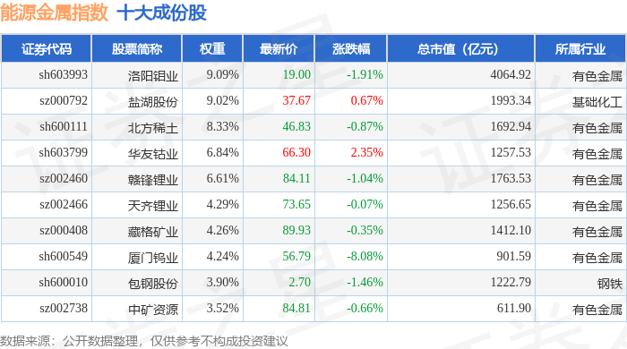 能源金属(399366)指数十大成份股详情如下: