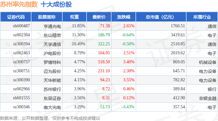 苏州率先(399410)指数十大成份股详情如下: