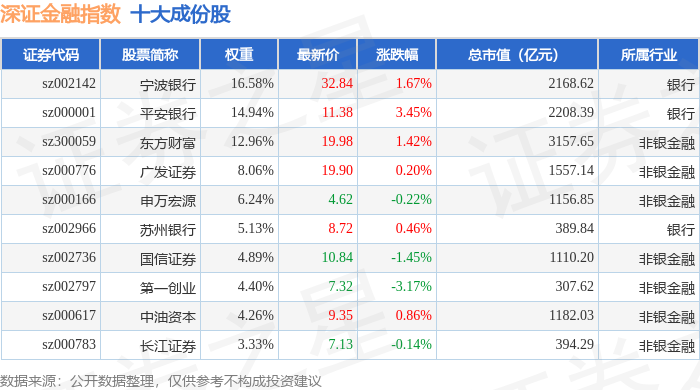 资金流向方面,深证金融(399619)指数成份股当日主力资金净流出合计2.74亿元,游资资金净流出合计4736.89万元,散户资金净流入合计3.22亿元。成份股资金流向详情见下表: