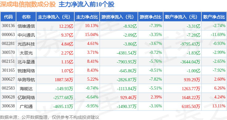 资金流向方面,深成电信(399688)指数成份股当日主力资金净流出合计26.63亿元,游资资金净流入合计27.2亿元,散户资金净流出合计5682.57万元。成份股资金流向详情见下表:
