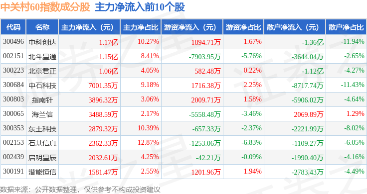资金流向方面,中关村60(399697)指数成份股当日主力资金净流出合计20.29亿元,游资资金净流入合计3.71亿元,散户资金净流入合计16.58亿元。成份股资金流向详情见下表: