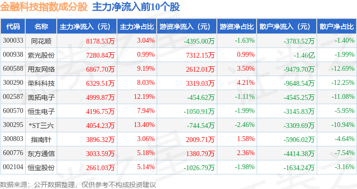 资金流向方面,金融科技(399699)指数成份股当日主力资金净流出合计5.88亿元,游资资金净流入合计2.05亿元,散户资金净流入合计3.8亿元。成份股资金流向详情见下表: