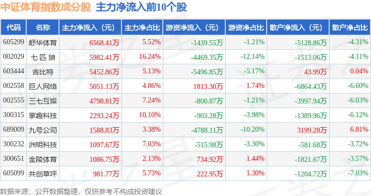 资金流向方面,中证体育(399804)指数成份股当日主力资金净流出合计7.5亿元,游资资金净流入合计3.45亿元,散户资金净流入合计4.05亿元。成份股资金流向详情见下表: