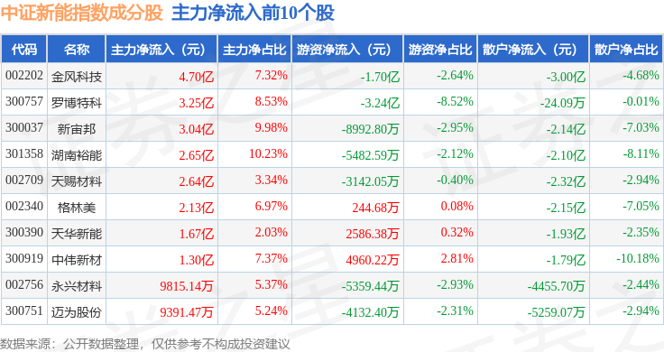 资金流向方面,中证新能(399808)指数成份股当日主力资金净流出合计70.27亿元,游资资金净流入合计24.81亿元,散户资金净流入合计45.26亿元。成份股资金流向详情见下表: