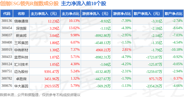 资金流向方面,创指ESG领先R(470031)指数成份股当日主力资金净流出合计59.23亿元,游资资金净流入合计39.38亿元,散户资金净流入合计19.84亿元。成份股资金流向详情见下表: