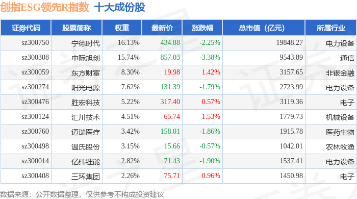创指ESG领先R(470031)指数十大成份股详情如下: