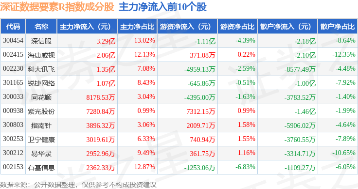 资金流向方面,深证数据要素R(470053)指数成份股当日主力资金净流出合计37.52亿元,游资资金净流入合计10.36亿元,散户资金净流入合计27.17亿元。成份股资金流向详情见下表:
