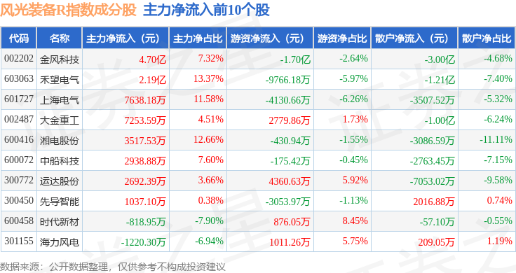 资金流向方面,风光装备R(480026)指数成份股当日主力资金净流出合计22.64亿元,游资资金净流入合计4727.41万元,散户资金净流入合计22.17亿元。成份股资金流向详情见下表: