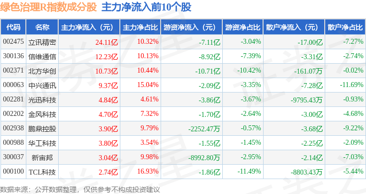 资金流向方面,绿色治理R(480058)指数成份股当日主力资金净流入合计53.76亿元,游资资金净流出合计23.59亿元,散户资金净流出合计30.17亿元。成份股资金流向详情见下表: