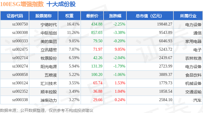 100ESG增强(970033)指数十大成份股详情如下: