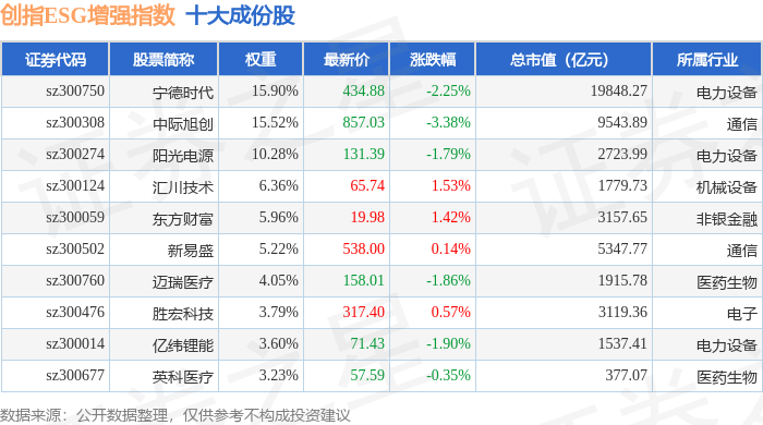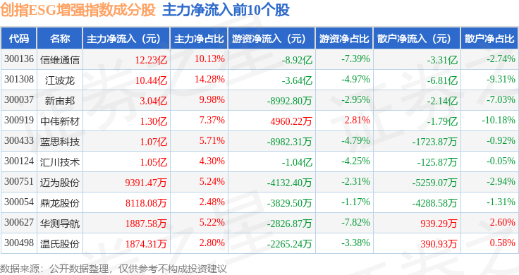资金流向方面,创指ESG增强(970034)指数成份股当日主力资金净流出合计56.36亿元,游资资金净流入合计41.51亿元,散户资金净流入合计14.85亿元。成份股资金流向详情见下表: