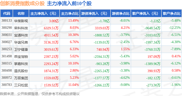 资金流向方面,创新消费(970041)指数成份股当日主力资金净流出合计12.31亿元,游资资金净流入合计1.21亿元,散户资金净流入合计11.1亿元。成份股资金流向详情见下表: