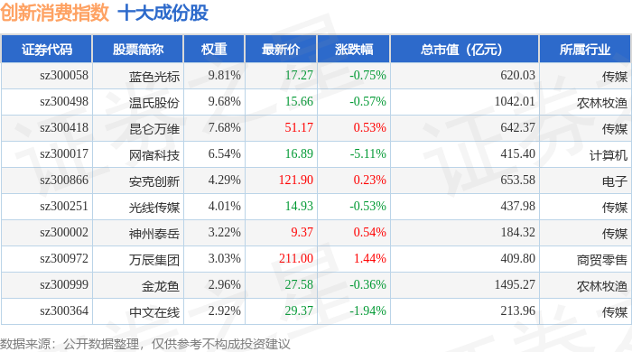 创新消费(970041)指数十大成份股详情如下: