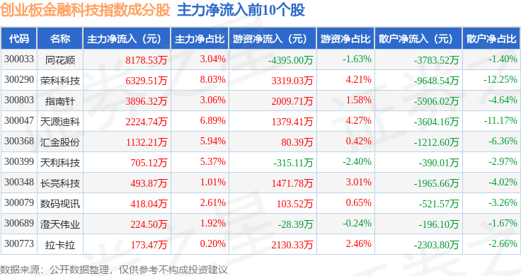 资金流向方面,创业板金融科技(970085)指数成份股当日主力资金净流出合计4.22亿元,游资资金净流入合计2.29亿元,散户资金净流入合计1.92亿元。成份股资金流向详情见下表: