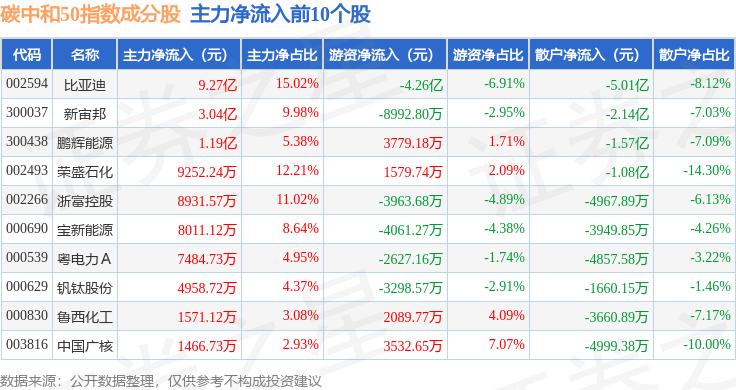 资金流向方面,碳中和50(980021)指数成份股当日主力资金净流出合计17.91亿元,游资资金净流入合计6.68亿元,散户资金净流入合计11.23亿元。成份股资金流向详情见下表: