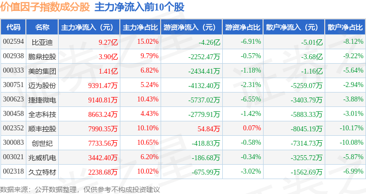 资金流向方面,价值因子(980056)指数成份股当日主力资金净流出合计715.73万元,游资资金净流入合计4.52亿元,散户资金净流出合计4.45亿元。成份股资金流向详情见下表: