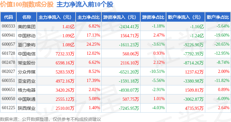 资金流向方面,价值100(980081)指数成份股当日主力资金净流出合计17.18亿元,游资资金净流入合计11.44亿元,散户资金净流入合计5.74亿元。成份股资金流向详情见下表: