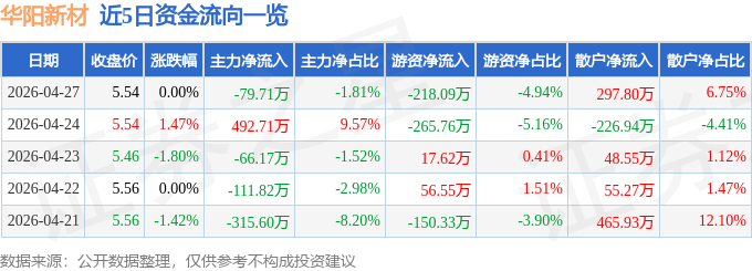 证券之星消息,截至2026年4月27日收盘,华阳新材(600281)报收于5.54元,上涨0.0%,换手率1.57%,成交量8.09万手,成交额4413.87万元。