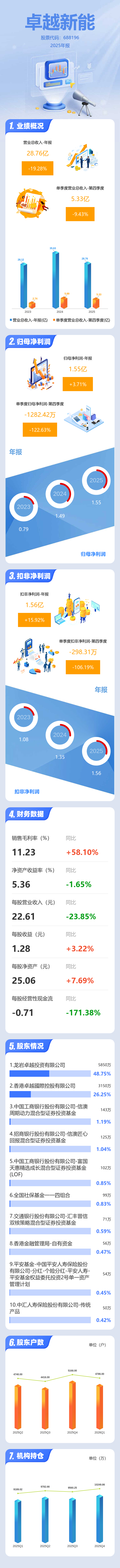 证券之星消息,卓越新能2025年年报显示,当年度公司主营收入28.76亿元,同比下降19.29%;归母净利润1.55亿元,同比上升3.71%;扣非净利润1.56亿元,同比上升15.92%;其中2025年第四季度,公司单季度主营收入5.33亿元,同比下降9.44%;单季度归母净利润-1282.42万元,同比下降122.63%;单季度扣非净利润-298.31万元,同比下降106.19%;负债率21.9%,投资收益1023.05万元,财务费用-1910.75万元,毛利率11.23%。